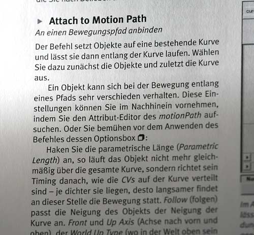 Attach to Motion Path ist der meist verwendete Befehl in dieser Reihe. Sie sehen, wie das im ganzen Buch der Fall ist, nach der strengen Übersetzung ("An einen Bewegungspfad anbinden") zunächst den grundsätzlichen Sinn ("Der Befehl setzt Objekte auf eine bstehende Kurve und lässt sie dann entlang der Kurve laufen.") und unmittelbar danach die Art der Anwendung: Erst die Objekte auswählen, die an der Kurve entlang laufen sollen, zuletzt die Kurve selbst. In vielen Fällen wird die Bewegung, die Sie so erhalten, nicht befriedigen, u.a. deshalb, weil das Objekt, etwa eine Kamera, sich nicht entlang der Kurve, sondern quer zu ihr ausrichtet. Deshalb folgt in den nächsten Absätzen eine Aufklärungen über Feineinstellungen, die Sie vorher oder nachher erledigen können.