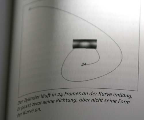Hier läuft ein Zylinder an einer Kurve entlang. Wenn Sie wünschen, dass sich der Zylinder dabei der Krümmung der Kurve anschmiegt, müssen Sie den Befehl Flow Path Object bemühen... |