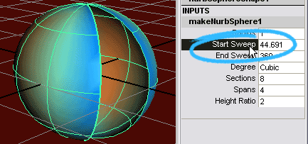 Now, with the middle mouse button in the modeling window change the value of Start Sweep interactively. You see the sphere open:  |