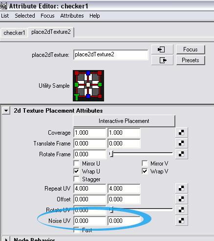 This is a NURBS plane, scaled and deformed. The texture is a simple checker board. Let's open the Attribute Editor of the checker's placement node: |