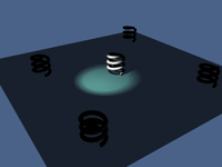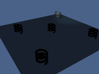 Drittes Beispiel: Eine Zufallsfunktion. Wenn Sie ein einfachs Tutorial suchen, wo Expressions erklärt werden, klicken Sie hier. Ich habe auf eine Ebene mehrere Spiralen gesetzt und einen Lichtspot darüber positioniert. Ich wollte, dass Maya mir Beleuchtungsszenarien vorschlägt, woraus ich dann eines auswählen würde. Dazu habe ich eine einzige Zeile Code geschrieben, die die Drehung des Lichts um seine X-Achse einer Zufallsfunktion unterwirft und Werte zwischen -100 und 0 Grad auswirft: |