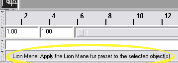 Now the Fur tab opens and displays the prefab furs. What kind of fur do they exactly simulate? In order to find this out, just move your mouse over any icon and look at the help line at the buttom of the Maya main window. In case of the icon marked by the arrow the help line reads like this: |
