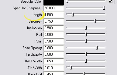 Es gibt mehrere Reiter, die mit Fell zu tun haben. Der für uns entscheidende ist LionMane. Sie sehen gleich darunter den wichtigen Parameter "Density", der über die Dichte des Fells entscheidet. Weiter unten finden Sie die Farben und die Länge des Fells: |