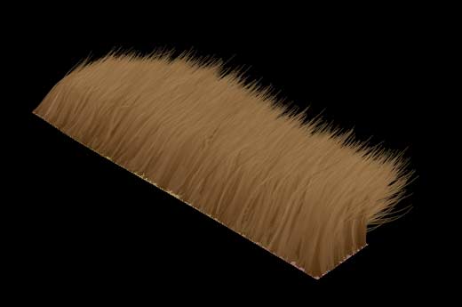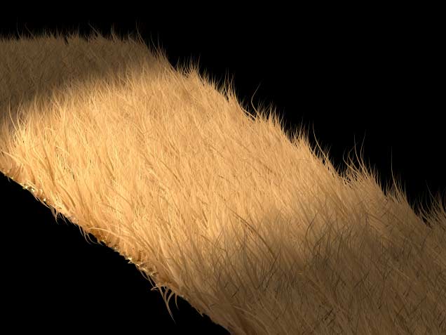 As you see the hair is shorter, thinner and looks less organized. I didn't change the colours but I added a key light which brightens up the center region. Note that the individual hairs don't cast shadows on each other. Maya Fur is capable of "Self Shadowing". This, however, is another topic... |