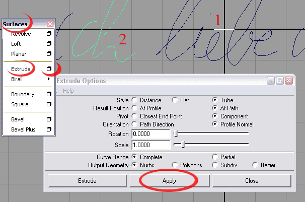 First you select the circle, then (Shift key!) the path, i.e. one of the freehand curves you created. Then you open the option box of Surfaces > Extrude. In the option box you change the settings like in the illustration above and click Apply. This creates a surface like the one you see below: |