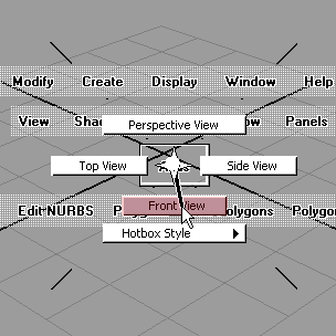 Let's start with the Perspective window in the illustration above. This is the view Maya shows in its full pride when you launch the program. Hold the Space Bar pressed and the Hotbox appears. Click in its center and select Front View. This changes the three dimensional Perspective window into the two dimensional view of the Front window. |