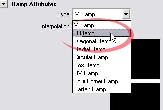 The cut is there, but you probably expected it to be horizontal rather than vertical. So, go back to the Ramp's Attribute Editor (via the right mouse button and Materials > Material Attributes for example) and change it's orientation on the surface from V Ramp to U Ramp: |