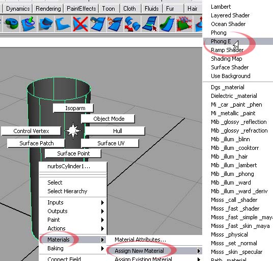I scaled mine slightly thinner and taller, but it doesn't matter for this sake. Assign a new material to the cylinder using the right mouse button. I for some obscure reason fancy the Phong E shader. You can choose any other as well. |