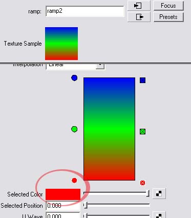 Again a window opens automatically, the window which lets us adjust the ramp. The default ramp consists of three colours. Here the small red disc is selected. If you click on the green disc the Selected Color field will show green. We'll use this information in a minute. |