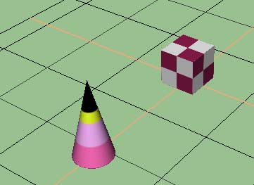 Verbinden - Das mag im wahren Leben eine aufregende Herausforderung sein, in Maya ist das Verbinden von Parametern eine etwas trockene Angelegenheit. Aber die "logische Verbindung von zwei oder mehr Attributen" kann durchaus aufregende Ergebnisse bringen. Hier ist die Maya 6 Binary-Szene. Wir beginnen mit zwei Grundkörpern: einem Kegel und einem Würfel: |