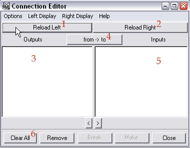 Let's briefly inspect the window in its empty state (illustration below): The button (1) loads the attributes of the selected object into the left column (3). Button (2) into the right column (5). Button (4) lets you switch whether you want left to direct right or right to direct left. And if you ever get lost in this window, press (6) to take it back into its clear state. |