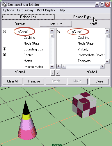 We will load the cone's attributes into the left side of the Connection Editor. Select the cone in the perspective window or Outliner. Press Reload Left in the Connection Editor. You see the cone's attributes fill the left side of the window. Next, select the cube and load its attributes into the right side of the Connection Editor: Reload Right. You can check if your selection worked out by looking at the top entries on both sides: pCone1 left and pCube1 right in the illustration below. |