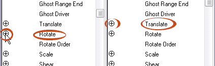 Man kann Stunden darüber meditieren, welche Attribute sich mit welchen Attributen verbinden lassen. Das soll uns jetzt nicht kümmern. Öffnen Sie auf der linken Seite die Rotate-Gruppe und auf der rechten die Translate-Gruppe. Wahrscheinlich müssen sie weit hinunterscrollen, um sie zu finden: |