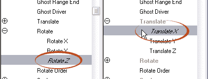 Flipping the Rotate section open reveals RotateX, RotateY and RotateZ. Click on RotateZ. In the right column click on TranslateX. That's it. |