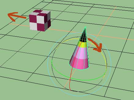 Jetzt ist die Drehung des Kegels um seine Z-Achse direkt mit der Bewegung des Würfels in X verbunden. Im Beispiel der Abbildung unten bewegt sich der Würfel nach links, während wir den Kegel im Uhrzeigersinn drehen. Das mag merkwürdig aussehen, aber sich als logisch entpuppen, wenn Sie sich überlegen, wo die X-Achse eigentlich hinzeigt. |