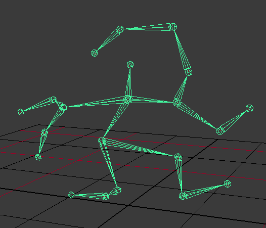 Note the change of the local coordinates. When you created the first joint its axis was aligned with the world axis. Since your second click its x-axis points in the direction of the bone. It points to the next joint. Below you see a pretty wild skeleton consisting of 20 bones and ?? joints. |