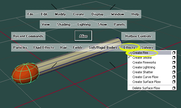 Klar können Sie Feuer haben! Es ist sogar ausgesprochen einfach herzustellen und macht viel Spaß! Hier ist die Maya 6 Binary-Szene. Feuer ist dynamisch. Drücken Sie also F4, um Maya in diesen Zustand zu bringen. Statt F4 können Sie auch das Pull-Down-Menü oben links bemühen. Feuer braucht ein Objekt, an dem es sich entzünden kann. Ich habe ein einfaches Streichholz aus einem Zylinder und einer lang gezogenen Kugel genommen. Wählen Sie das Objekt aus (in meinem Fall die Steichholzspitze, also die Kugel) und lösen Sie den Befehl Effects -> Create Fire aus. |