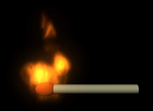 Sure you can have a light! It's easy, and it's a rewarding experience! Here's the Maya 6 Binary scene. Fire is dynamic, so you have to press F4 or use the pull-down menu at the upper left to enter the realm of "Dynamics". You need an object to catch light. I created a match from a cylinder and a sphere, slightly scaled. Now, select the object (the sphere - the tip of the match, in my case) and invoke Effects -> Create Fire. |