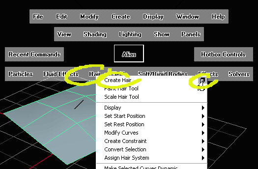 Hair in Maya belongs to the "Dynamics" section with its own set of commands. Press the F4 key to switch to Dynamics. Select the object (the plane in this case) and open the option box of Hair -> Create Hair. |