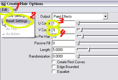 We could this without the option box, but you wanted one single hair, and here is the place to do this choice. In the "Create Hair Options" first reset the settings to default (Edit -> Reset Settings). Then reduce the U and V count from 8 to 1. |