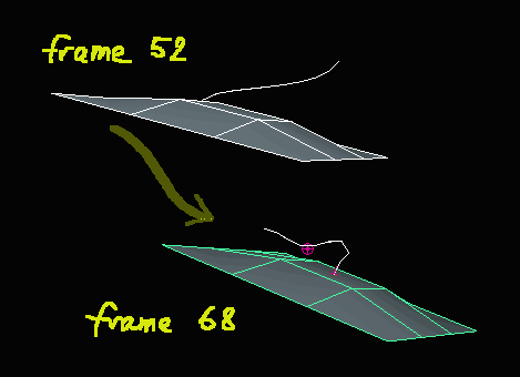Gut, machen wir ein Haar. Ein einziges. Hier ist die Maya 6 Binary-Szene. Ein Haar sieht interessanter aus, wenn es herumschaukelt. Erzeugen Sie dazu zunächst ein Objekt (Ich habe eine leicht deformierte Polygon-Fläche genommen), und animieren Sie es. Es soll sich ordenlich herumbewegen. |