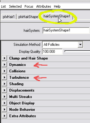 There are many ways to go from here. Open the hair's Attribute Editor, select the hairSystemShape and play with the parameters. A good starting point are the options in the Dynamics and Turbulence menu groups. Let the animation run while you adjust parameters! The thickness of the hair ("Hair Width") is under "Clump and Hair Shape". |