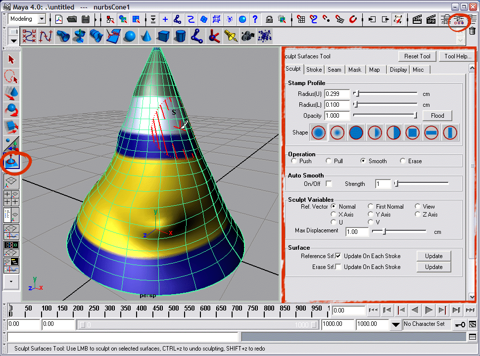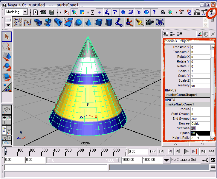 Natürlich haben alle Icons einen Sinn - solange man weiß, welchen. Nehmen wir uns einmal die drei Icons am oberen rechten Bildschirmrand vor. Sie sind so komplex, dass sie eigentlich nichts erklären. Man muss sie kennen. Das ganz rechte soll die Channel Box darstellen. Die Channel Box brauchen wir, um grundsätzliche Einstellungen vorzunehmen, etwa die Isoparm-Dichte eines Kegels wie in der Abbildung unten. |