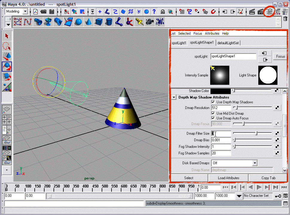 In other cases the Channel Box doesn't give you enough detail. For example if you want to access the shadow section of a light, you need the Attribute Editor. In previous days you would have pressed CTRL-A to bring the Attribute Editor into view. With Maya 4 you click on the left of the three icons and the Channel Box is being substituted by the Attribute Editor - which, of course, takes up more space. Another click on the same icon makes the Attribute Editor disappear. |