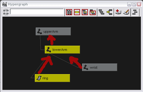 The logical structure of the arm and the ring is a structure of parent-child dependencies. In the Hypergraph you see the upperArm being the grandfather of the lowerArm parent. The lowerArm parent has two children, the ring and the wrist. But this is not the only way to look at the scene: You can also interpret it as group within a group. The inner group is the lowerArm with its children. The outer group contains only one member, namely the lowerArm. |