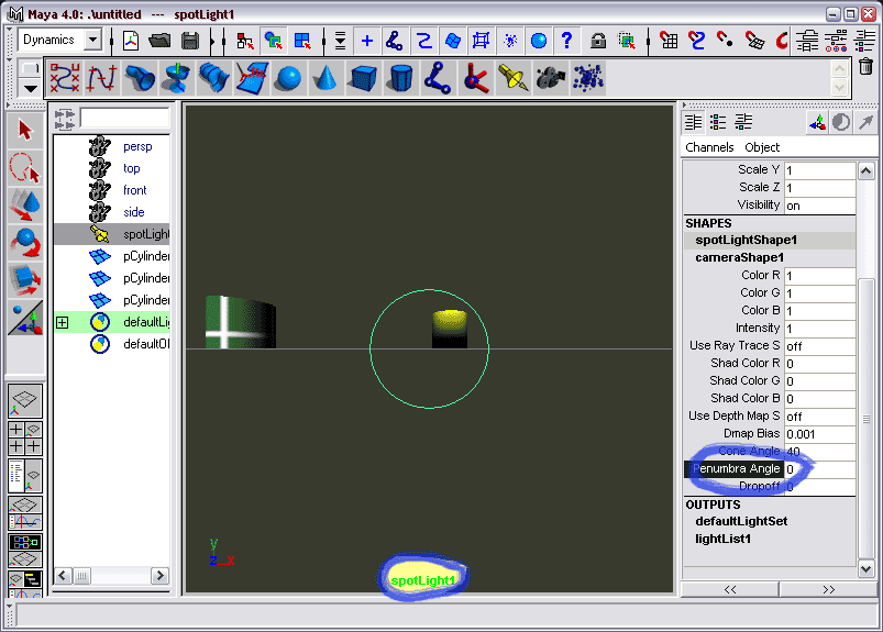 In the Channel Box on the right, change the penumbra angle from 0 to a value in the range of 10. Press the 5 key, followed by the 7 key to activate hardware texturing and light shading. Use the ALT-key to move around in the scene as usual. What you actually do now is move and rotate the light source. Using this technique position the light nicely like in the illustration above. Finally, return to the perspective view by middle-mouse-dragging the perspective camera from the Outliner into the viewport - like in the illustration below. |