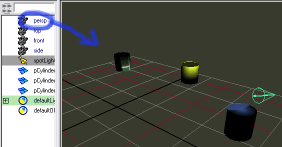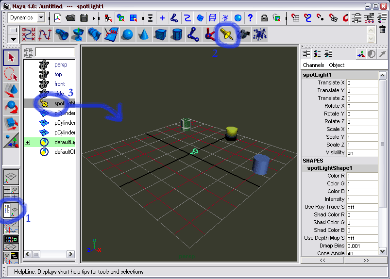 Follow the illustration above: With a few objects distributed in the scene, 1) change the window layout so that you have the Outliner handy on the left and the perspective window in the middle, 2) create a spot light and 3) middle-mouse-drag it from the Outliner into the perspective window. |