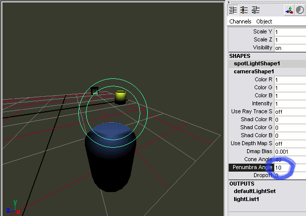 Erhöhen Sie nun in der Channel Box rechts den Wert für den Penumbra Angle von 0 auf z.B. 10. Dieser Winkel gibt die Größe des Lichthofs um das hart abschließende Zentrum des Lichtkegels an. Drücken Sie die Taste 5, gefolgt von der Taste 7, um das Light Shading einzuschalten - eine grobe Art, den Einfluss des Lichts anzudeuten. Bewegen Sie sich mit der ALT-Taste wie gewohnt. In Wirklichkeit bewegen und drehen Sie dabei die Lichtquelle. Positionieren Sie sie, bis es Ihnen gefällt. (Abbildung oben)