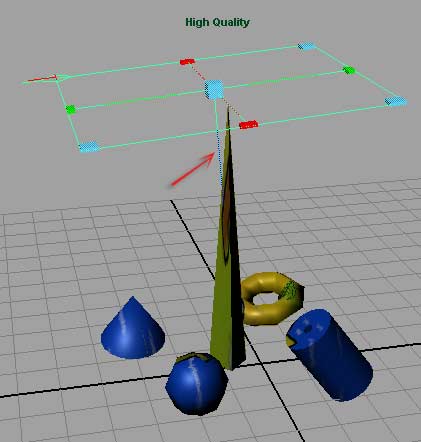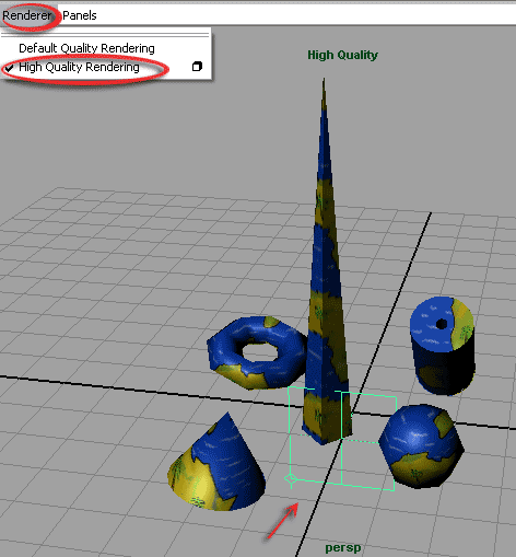 Sie sehen in Ihrer Szene ein neues grünes Objekt. Das ist Ihr Projektor. Ich empfehle Ihnen jetzt, mal im Renderer-Menü "High Quality Rendering" einzuschalten, falls Ihre Grafikkarte das unterstützt. Das macht die Szene zwar etwas träger navigierbar, aber Sie sehen die Texturen dann fast so gut, als würden Sie sie rendern: |