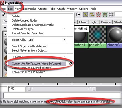 All major windows in Maya have their own sets of pull down menus. The one we need here is Edit --> Convert to File Texture. The command bakes the image onto the objects and for this purpose creates several individual texture files. Before applying the effect, take a not of the hint on the very buttom of your Maya window. The status lines tells you exactly what to do: "select texture and surface(s): |