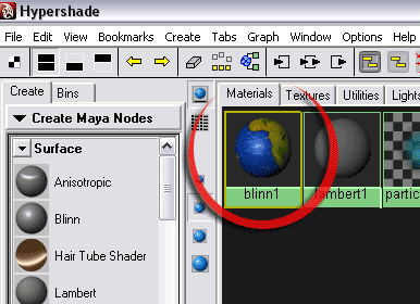 Treffen Sie jetzt also die Vorbereitungen, um den Befehl anzuwenden: Wählen Sie im Hypershade-Fenster die Textur aus - es handelt sich in unserem Beispiel um ein Blinn-Material: |