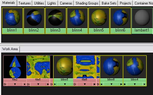 Since selecting the Blinn is only the beginning of our selection process you'll need to press the Shift key now to select the objects in your 3D scene. If you forget pressing Shift you'll lose the selection of the texture and the command will produce an error. With the Blinn and the objects in the scene selected, go back to the Hypershade window and chose Edit --> Convert to File. Depending on the complexity of the scene this might take a couple of seconds or even longer. Be patient. Maya writes out file textures to your hard drive (into the folder of your current project) and the Hypershade window fills up accordingly: |