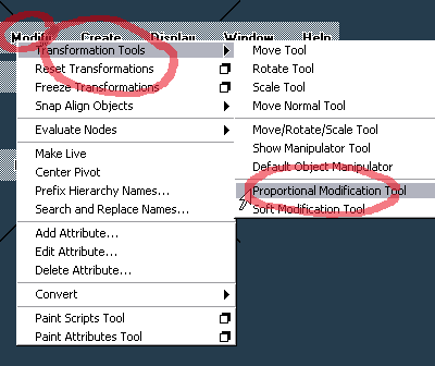 Klappen Sie im Outliner ganz rechts die Sektion INPUTS von makeNurbPlane auf und ändern die Eintragungen gemäß der Abbildung oben. Wir brauchen für unser proportionales Experiment fettere Geometrie. Nun ist es Zeit für den Befehl des Tages: Modify > Transformation Tools > Proportional Modification Tool |