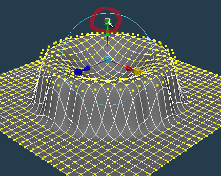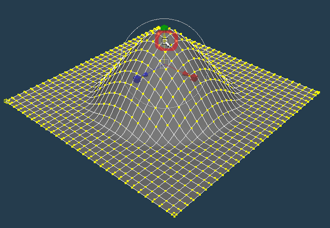 Das Proportional Modification Tool bewegt alle ausgewählten CVs (das sind in unserem Fall alle Punkte der Fläche) so nach oben, dass der zentrale CV dem Werkzeug direkt folgt, die anderen aber proportional weniger, je weiter sie vom Zentrum entfernt sind. Das normale Transformationswerkzeug (Taste W) würde alle Punkte gleich weit bewegen. Ziehen Sie an einem der Skalierungs-Würfel, so skaliert das Werkzeug die Punkte proportional. Stets kommen dabei weiche Verformungen heraus. |