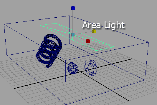 The image above took 5 seconds to render on my rather old pre-dual core 2 GHz machine. The rendering shows all textures but the lighting looks indifferent. You couldn't tell where the light actually comes from. It casts no shadows, only some self-shadowing effects give the impression of 3D objects. In other software packages like Cinema 4D the first rendering of such a simple scene looks much better because it uses different algorithms. Maya usually starts with a depressing image. Or do you find it inviting? First thing in order to improve the look is some controllable light. I'll go for an area light shedding its energy from the very top of the cube onto the three objects inside like in the illustration below:  |