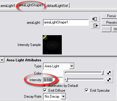 The image is over exposed. This has to do with an odd behaviour of the area light. Let's go to the attribute editor of the light and lower its intensity:  |