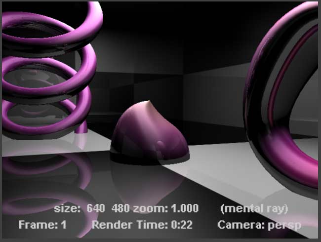 Wenn Sie auf die Render Time blicken, sehen Sie, dass die Szene deutlich länger brauchte, gerendert zu werden. Noch mehr Zeit braucht der Mental Ray Renderer, wenn wir ihn dasselbe, aber mit Reflexionen berechnen lassen:  |