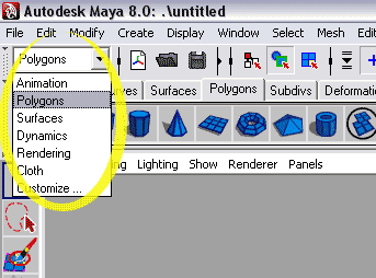 Das Pulldown-Menü oben links wurde neu geordnet und erweitert. Man kann dieses häufig benutzte Menü nun nach Bedarf zusammenstellen ("Customize"). Außerdem sind Polygone jetzt von den restlichen Flächen ("Surfaces") getrennt aufgelistet. Diese Trennung wirkt sich auf das Hauptmenü und die Hotbox aus und führt dort zu mehr Übersicht. Auch die Tastenbefehle, um Maya in die entsprechenden Modi zu bringen, haben sich damit geändert: F5 ist jetzt Dynamics, F6 Rendering. |
