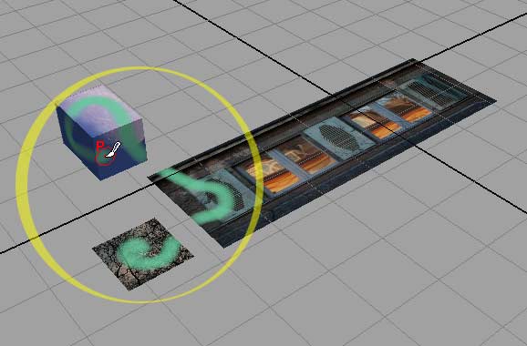 Bisher musste man sich bei den Artisan-Malwerkzeugen entscheiden, auf welche Fläche man z.B. malen wollte. Mit Maya 8 wird das Malen von Attributen (also nicht nur Farbe) über mehrere Flächen möglich. Die drei Objekte in der Abbildung (zwei NURBS-Flächen, ein Polygonquader) tragen unterschiedliche Texturen. Mit dem "3D Paint Tool" male ich mit einem einzigen (grünen) Strich über sie alle hinweg: |