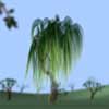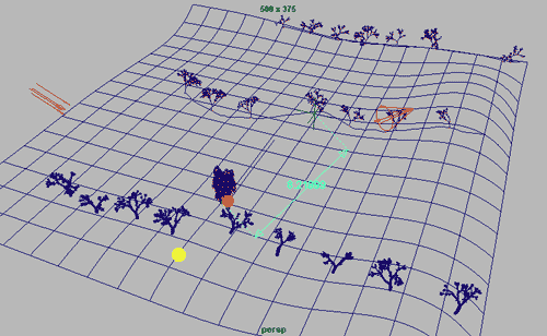 This is the scene I prepared. You see three rows of trees and a willow tree in the middle, close to the first row. The yellow dot indicates the camera position. Later I'll move the camera forward to the willow tree. The measurement tool is useful when setting the focus of the camera for the DOF-effect. |