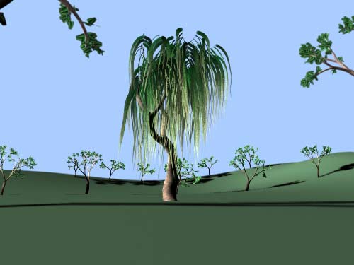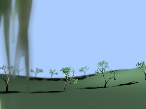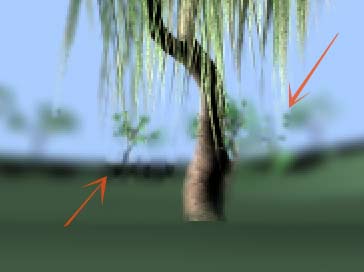 Maya rendert die Szene erst normal und legt die Tiefenschärfe dann als Post-Prozess darüber. Renderman berechnet die Tiefenschärfe gleich mit dem normalen Rendern mit und ist deshalb zuverlässiger, insbesondere wenn man die Kamera bewegt. Mayas Post-Prozess bringt manchmal seltsame Dinge ins Bild, die eigentlich dahin gehören. Unten sehen Sie ein Beispiel, herausvergrößert aus dem Bild oben: Die Bäume hinten dürften nicht scharf sein, sie sind es aber, weil sie sich optisch (aber eben nicht räumlich) in der Nähe der Trauerweide befinden. |