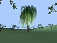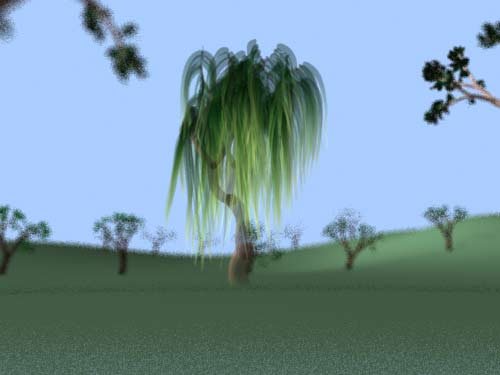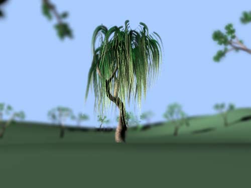 Schließlich habe die die Kamera nach vorn, unter die Weide bewegt. Ich wollte herausfinden, wie Renderman die Blätter, die von dem Baum herunterhängen, darstellt, wenn sie so nah und unscharf sind. Das nächste Bild zeigt das Ergebnis bei (einer simulierten) Blende von 5,6. Bewegen Sie die Maus darüber, und Sie sehen einen dezenteren Unschärfeeffekt bei Blende 12. |