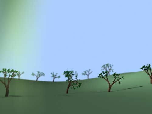 Die meisten Objekte in der Szene sind mit den Paint Effects erstellt. Maya (links) rendert solche Objekte anders als Renderman (Siehe Experiment #6).Unten sehen Sie etwas größer das von Maya gerenderte Bild. Wenn Sie die Maus darüber bewegen, erscheint das Renderman-Bild. |