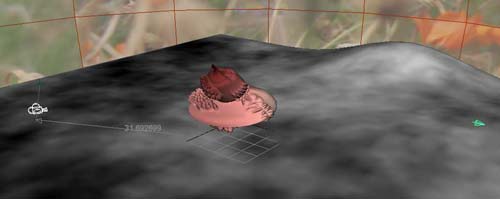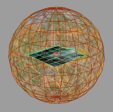 Das ist die Szene von weit weg. Sie sehen die Occlusions-Kugel, die Renderman automatisch erzeugt, wenn man Global Illumination rendern will. Die Kugel trägt eine von mir eingebrachte Textur - ein Foto einer Blumenwiese. |