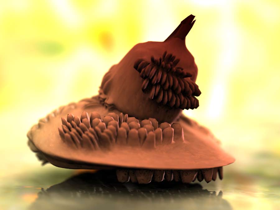 Das ist nur ein kleines Experiment. Ich wolle sehen, wie leicht und schnell es geht, ein ziemlich komplexes Objekt mit Reflexionen, Tiefenschärfe und einem separaten Verdeckungs-Durchgang (Occlusion Pass) zu rendern. Ich habe das Objekt aus einer rotierten Kurve entwickelt. Es sind hier keine Bump- oder Displacement-Maps im Spiel. |