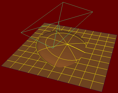 Ich musste ein wenig nachdenken und habe dann einen zweiten Anlauf genommen, mit einer anderen Fragestellung: Wie erledigt Renderman die Übergänge zwischen zwei sich durchdringenden Flächen, die beide das gleiche Verformungsmaterial tragen? Hier ist die Szene: Eine Polygonfläche, eine platt gedrückte und gedrehte NURBS-Kugel, die in den Boden eindringt, sowie ein großes Flächenlicht geringer Intensität, keine Schatten. |